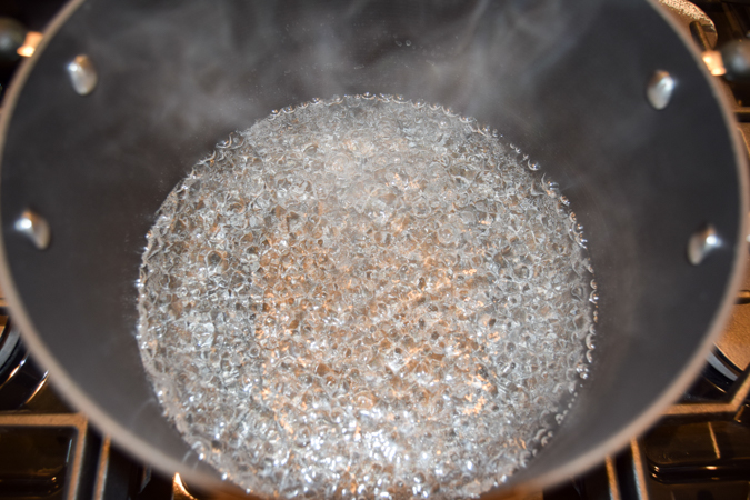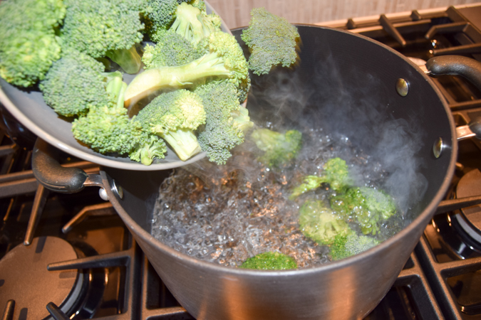 Step 2: Sprinkle water with salt, add broccoli, boil for two minutes, remove, and strain.