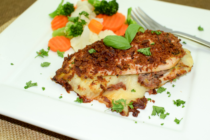 - Stuff each breast with 2oz shaved roast beef and manchego cheese. Close tight as possible. Brush Chicken breast with dijon mustard and sprinkle crumbled bacon over the top.