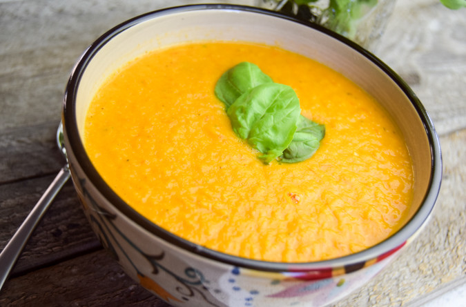 What could be better than a cup of hot soup made from delicious roasted veggies like tomato, onion, and garlic?!